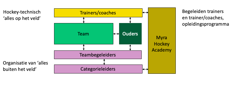 Soms is de trainer óók coach, maar vaak worden coaches uit het team of de oudergroep aangesteld. De Myra Hockey Academy ondersteunt trainers en coaches in hun ontwikkeling, en zorgt voor een doorlopend opleidingsprogramma.